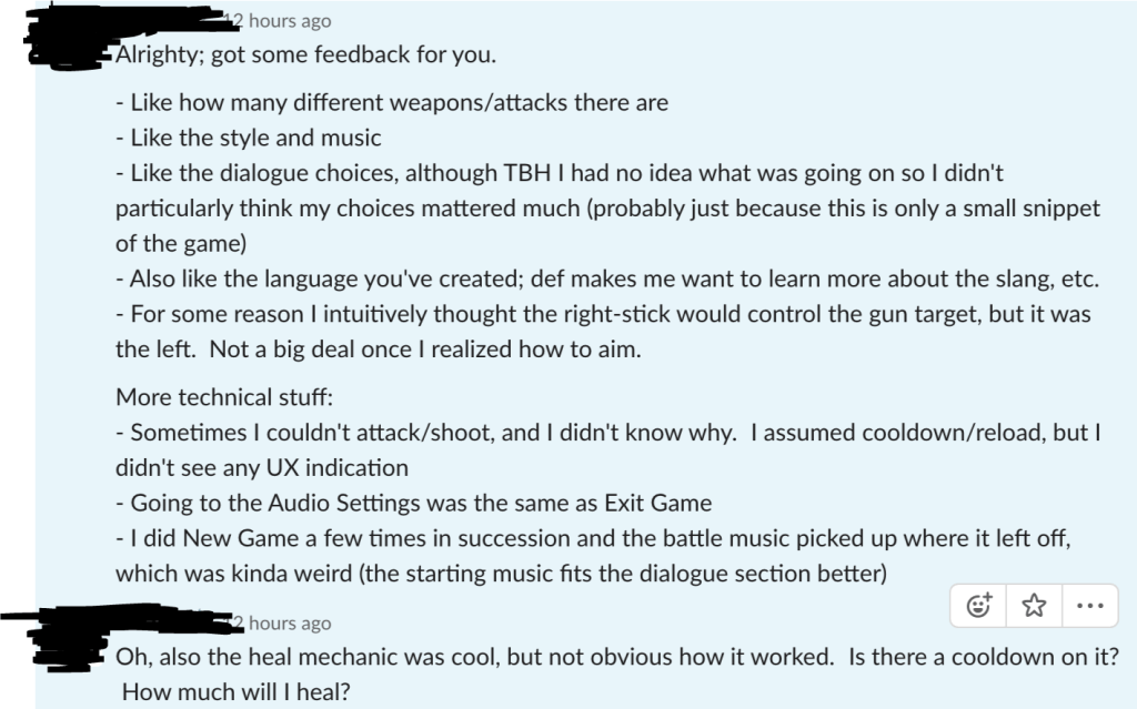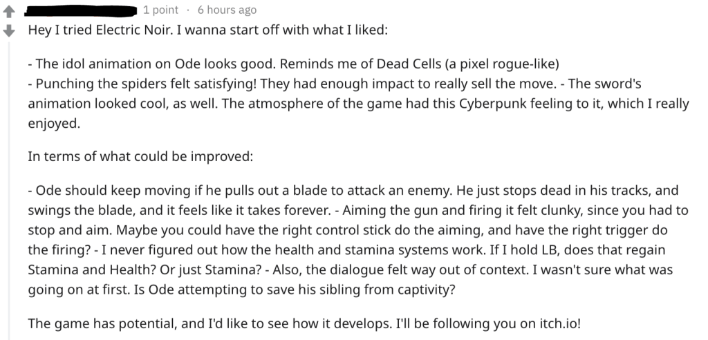 Also, folks called out the dialogue/lore as something they enjoyed and wanted to know more about. This was unexpected, the section of the game that I released is extremely far into the narrative, but it checked the two goals for the alpha best so I ran with it. Glad it paid off here.